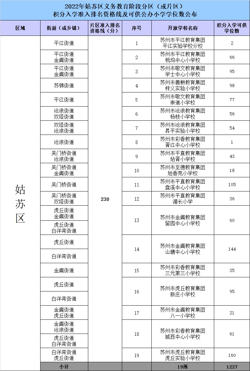 根据《苏州市流动人口积分管理办法》(苏府规字〔2020〕15号)、《苏州市义务教育阶段流动人口随迁子女积分入学实施细则》(苏教规〔2020〕1号)文件要求,经姑苏区政府和市教育行政部门批准,2022年姑苏区小学积分入学准入排名资格线及可供积分入学小学起始年级公办学位数公布。