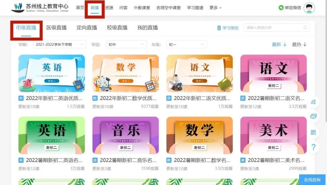 登录“苏州线上教育中心” (https://sjxs.suzhou.edu.cn/),点击上方导航栏“直播”模块,在“市级直播”页面筛选学期、学段、年级,进入专题观看名师课程。