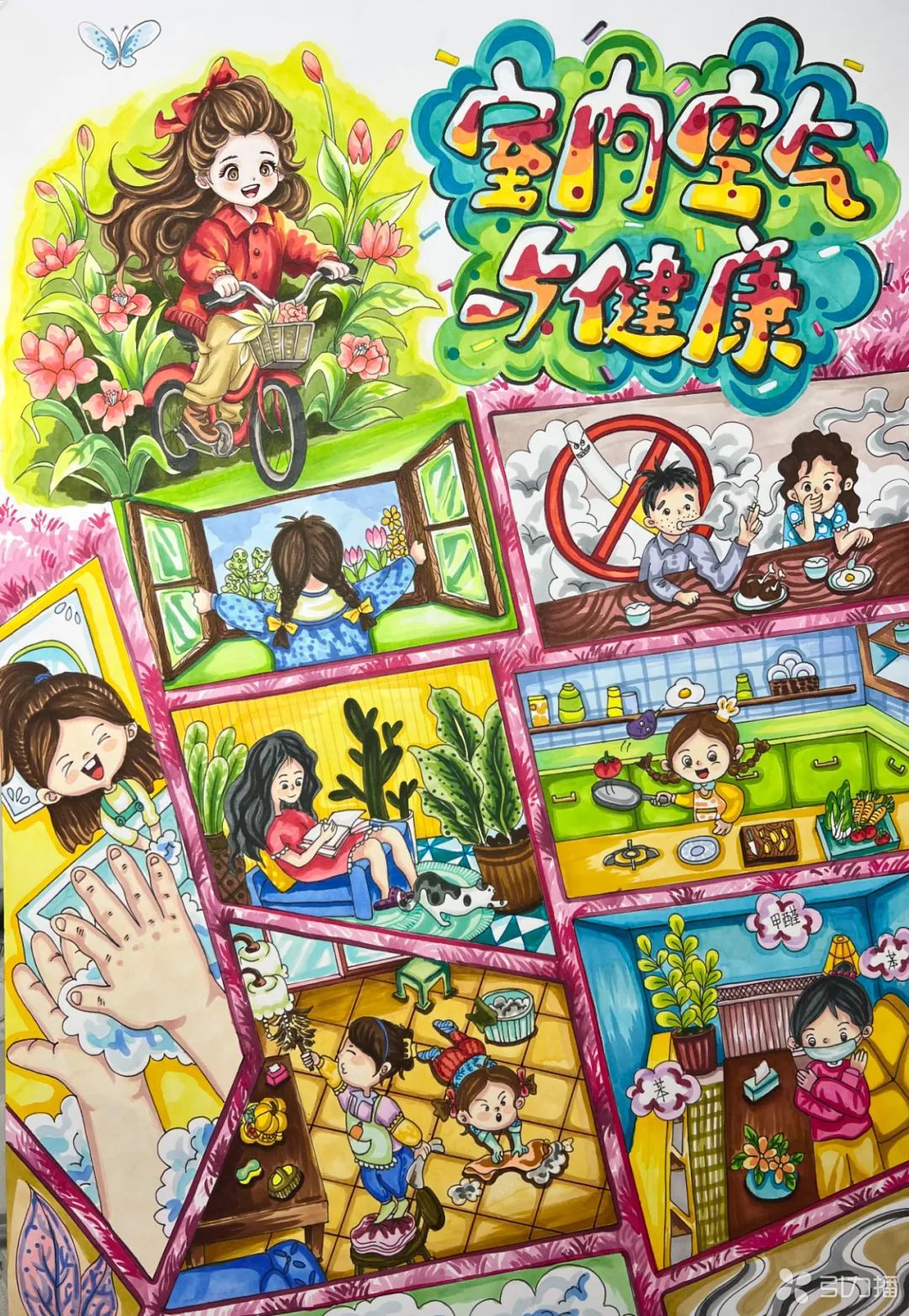 杨歆妍同学的作品深刻地表达了室内空气质量对人体健康的重要性,通过细腻的笔触和生动的色彩展现了对健康环境的愿景。画作中不仅展现了卓越的艺术才华,更体现了她对环保理念的深刻理解和关注,展示了苏州学生全面发展的教育成果。