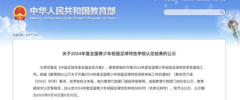 5月16日,教育部官方最新发布《关于2024年度全国青少年校园足球特色学校认定结果的公示》,拟认定2024年全国青少年校园足球特色学校5892所,其中苏州有39所学校上榜。