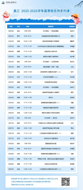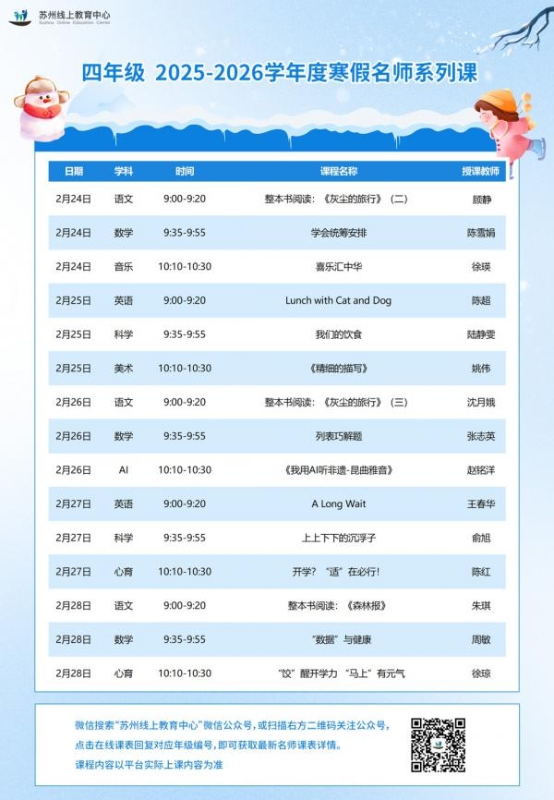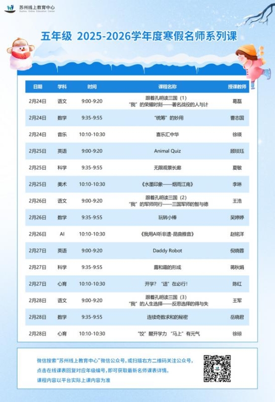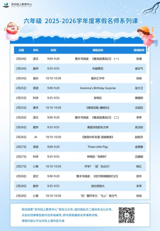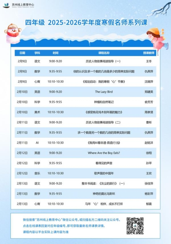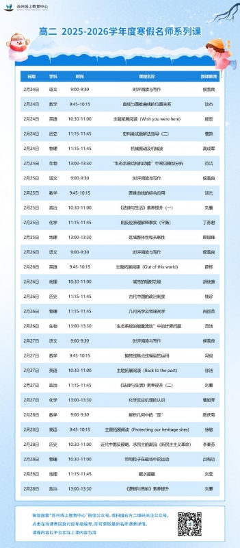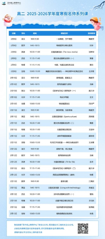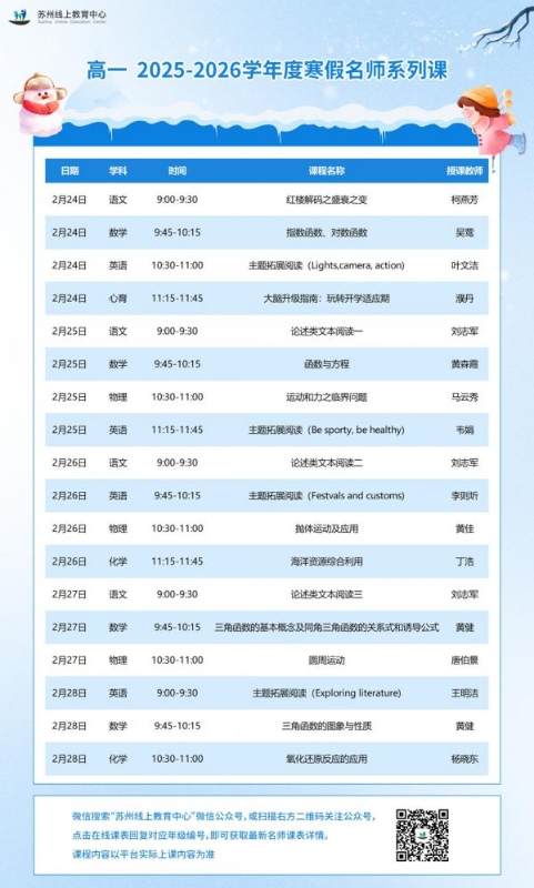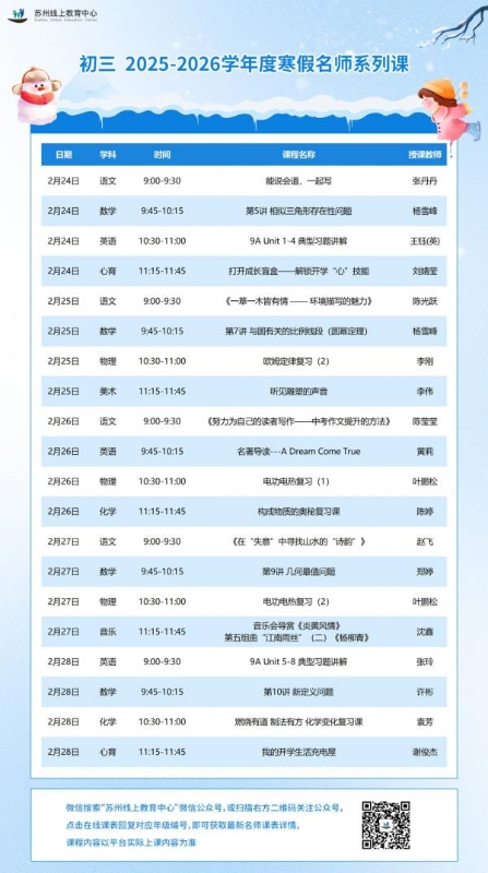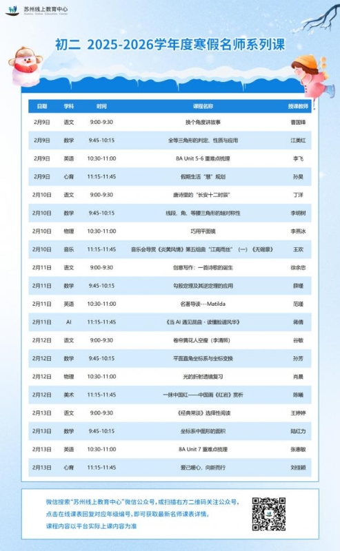 本次寒假名师系列课程将于2月9日(周一)开课,持续至2月28日(其中春节法定假日课程暂停)。具体每日课程内容,请登录苏州线上教育中心平台或APP,选择“市级推荐课程”专题中查看。