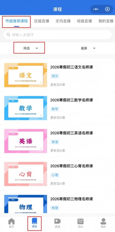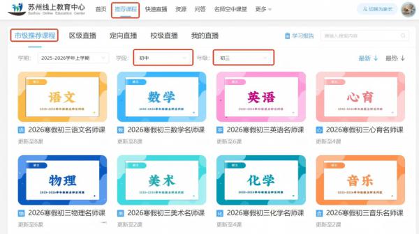 登录苏州线上教育中心网页端,在“推荐课程”中选择“市级推荐课程”;筛选“学段”,“年级”;即可选择课程学习。