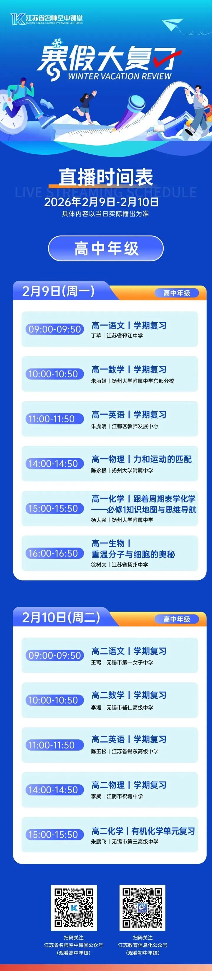 “寒假复习课堂”分两阶段开播:第一阶段“寒假大复习”2月9日—10日,第二阶段“寒假学法指导”2月26日—27日,第一阶段直播安排已经发布。