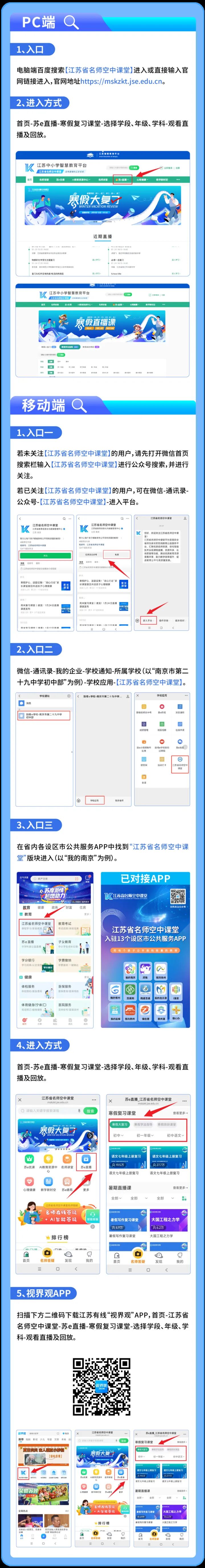 寒假期间,江苏省教育厅将持续提供优质线上教育资源,在春节前后分阶段为学生开设各学科“寒假大复习”“新学期学法指导”直播课堂,同时倡导布置活动性、体验性、探究性的实践项目,搭配适量体育运动,引导学生在动手实践中提升综合素养与创新能力。做好学生关爱工作,在放假前集中开展一次心理健康教育,引导学生及家长关注情绪变化,科学应对压力。